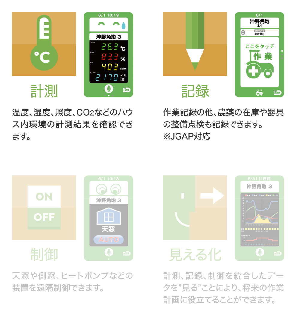 温度、湿度、照度、CO2の環境計測と農作業の記録ができるシンプルモデル。